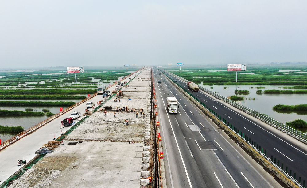 2024年7月4日,在京哈高速公路遼寧段改擴(kuò)建工程項(xiàng)目施工現(xiàn)場(chǎng),中鐵四局建設(shè)者進(jìn)行橋面施工作業(yè)(無(wú)人機(jī)照片)。新華社記者 楊青 攝