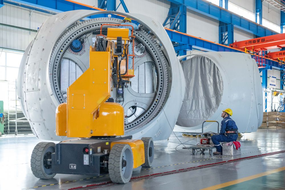 2024年4月28日,工人在位于黑龍江省齊齊哈爾市的中國(guó)一重集團(tuán)有限公司風(fēng)電設(shè)備裝配車間加工風(fēng)電輪轂。新華社記者 謝劍飛 攝