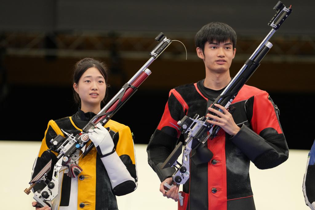 7月27日,中國選手黃雨婷/盛李豪(右)在贏得巴黎奧運會首枚金牌后。新華社記者 鞠煥宗 攝