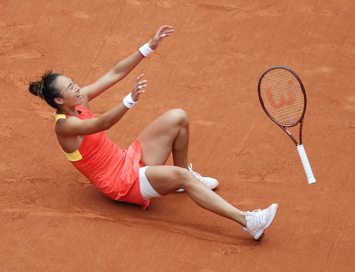 中國選手鄭欽文在巴黎奧運(yùn)會(huì)網(wǎng)球女子單打金牌賽后慶祝奪冠(2024年8月3日攝)。新華社記者 高靜 攝