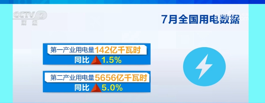 入夏以來,全國多地出現(xiàn)持續(xù)性高溫天氣,最大用電負荷快速攀升,電力供應保障有力有效。7月份,全社會用電量9396億千瓦時,同比增長5.7%。從分產業(yè)用電看,第一產業(yè)用電量142億千瓦時,同比增長1.5%;第二產業(yè)用電量5656億千瓦時,同比增長5.0%;第三產業(yè)用電量1871億千瓦時,同比增長7.8%;城鄉(xiāng)居民生活用電量1727億千瓦時,同比增長5.9%。