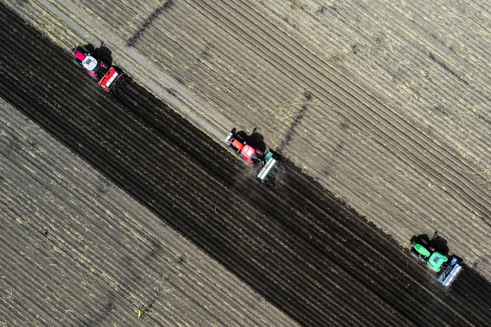 2024年6月25日,大型農(nóng)機(jī)在黑龍江北大荒集團(tuán)鶴山農(nóng)場作業(yè),為土壤增溫放寒(無人機(jī)照片)。今年,黑龍江推進(jìn)高標(biāo)準(zhǔn)農(nóng)田建設(shè)、侵蝕溝治理和農(nóng)田防護(hù)林更新修復(fù)一體化實(shí)施,建設(shè)高標(biāo)準(zhǔn)農(nóng)田1400萬畝、治理侵蝕溝1.2萬條,全面加強(qiáng)黑土地保護(hù)利用。