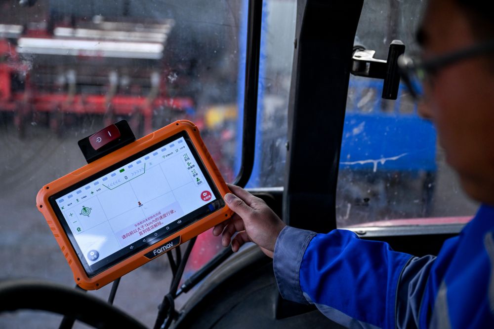 2024年3月13日,黑龍江北大荒(佳木斯)精準(zhǔn)農(nóng)業(yè)科技有限公司工作人員測試北斗自動(dòng)駕駛儀產(chǎn)品。