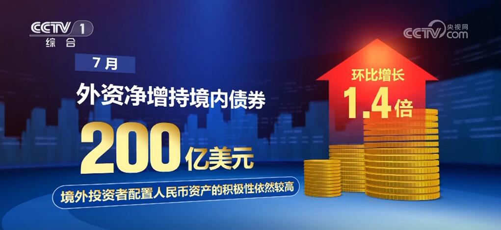 國家外匯管理局數(shù)據(jù)顯示,7月,外資凈增持境內(nèi)債券200億美元,環(huán)比增長1.4倍。境外投資者配置人民幣資產(chǎn)的積極性依然較高。