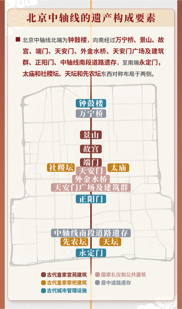 北京中軸線始建于元,成型、豐富于明清,發(fā)展、傳承于近現(xiàn)代,是逾7個(gè)世紀(jì)城市歷史遺存不斷累積疊壓的結(jié)果,成為北京老城獨(dú)特景觀秩序的極致體現(xiàn)。元至元四年(1267年)至明永樂(lè)三年(1405年),初步確立了北京中軸線的位置與基本形態(tài)。明永樂(lè)四年(1406年)至明嘉靖四十三年(1564年),北京城形成“凸”字形城郭格局,北京中軸線的整體格局基本形成。現(xiàn)存古代皇家宮苑、祭祀建筑和城市管理設(shè)施均始建于這一時(shí)期。明嘉靖四十四年(1565年)至1911年,北京中軸線的整體格局得以保持和延續(xù),清乾隆年間對(duì)北京城規(guī)劃格局的調(diào)整與完善,進(jìn)一步豐富與加強(qiáng)了中軸線的景觀秩序。1912年以后,原有服務(wù)于皇權(quán)的儀式性空間轉(zhuǎn)變?yōu)榉?wù)公眾的開(kāi)放空間。中華人民共和國(guó)成立后,天安門(mén)廣場(chǎng)的規(guī)劃與建設(shè)延續(xù)并強(qiáng)化了中軸線居中、對(duì)稱(chēng)的規(guī)劃格局,北京中軸線作為北京城市發(fā)展的基準(zhǔn)線仍然發(fā)揮著統(tǒng)領(lǐng)性作用。