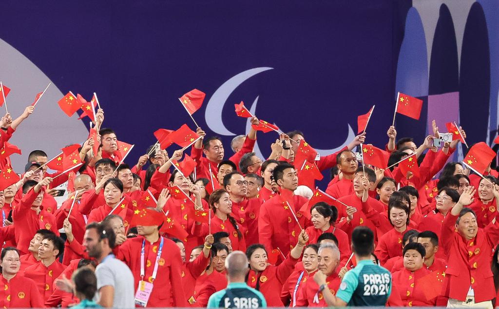 8月28日,中國體育代表團(tuán)在巴黎殘奧會(huì)開幕式上入場。新華社記者 侯俊 攝