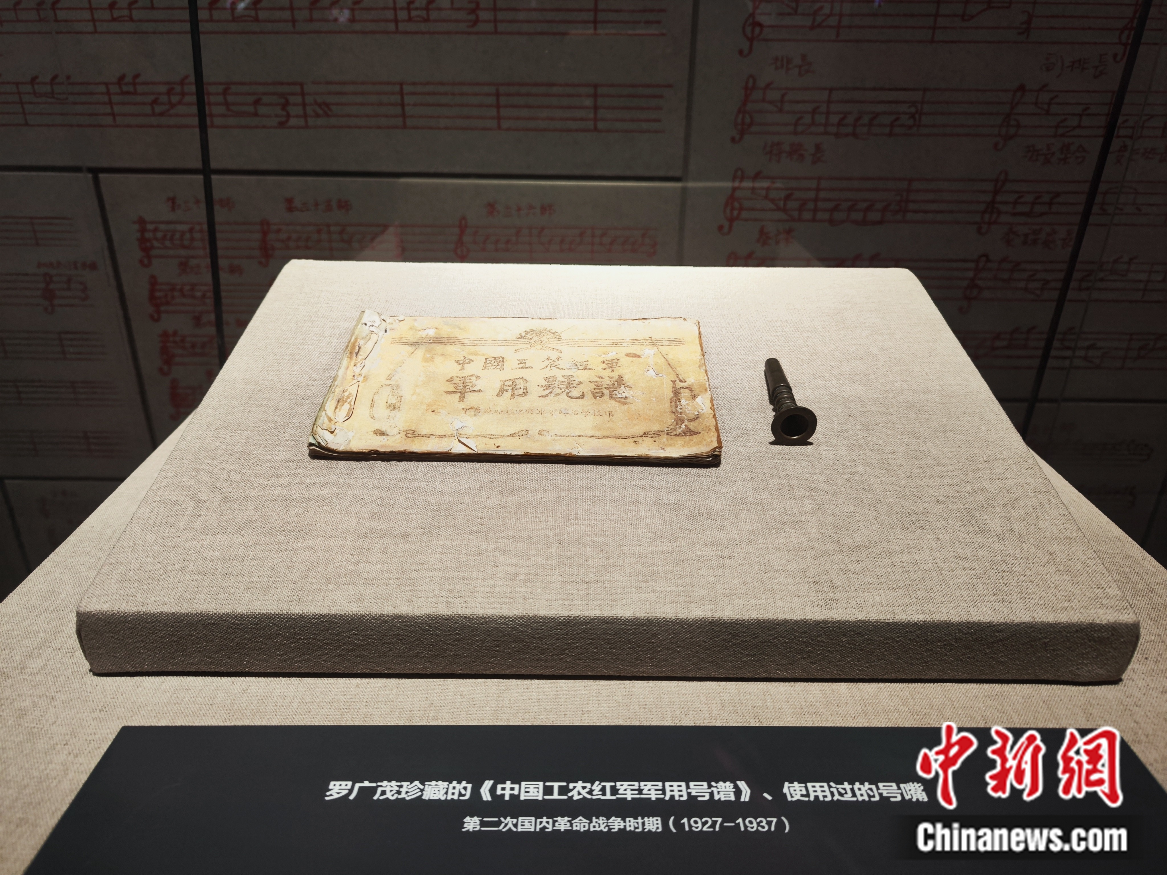 如此多的司號員設計,源于此地的“鎮(zhèn)館之寶”,一本1932年印制的《中國工農(nóng)紅軍軍用號譜》。這是目前全國唯一一本最完整、正規(guī)出版、印刷的紅軍軍號譜。捐獻這本號譜的,正是老紅軍羅廣茂。