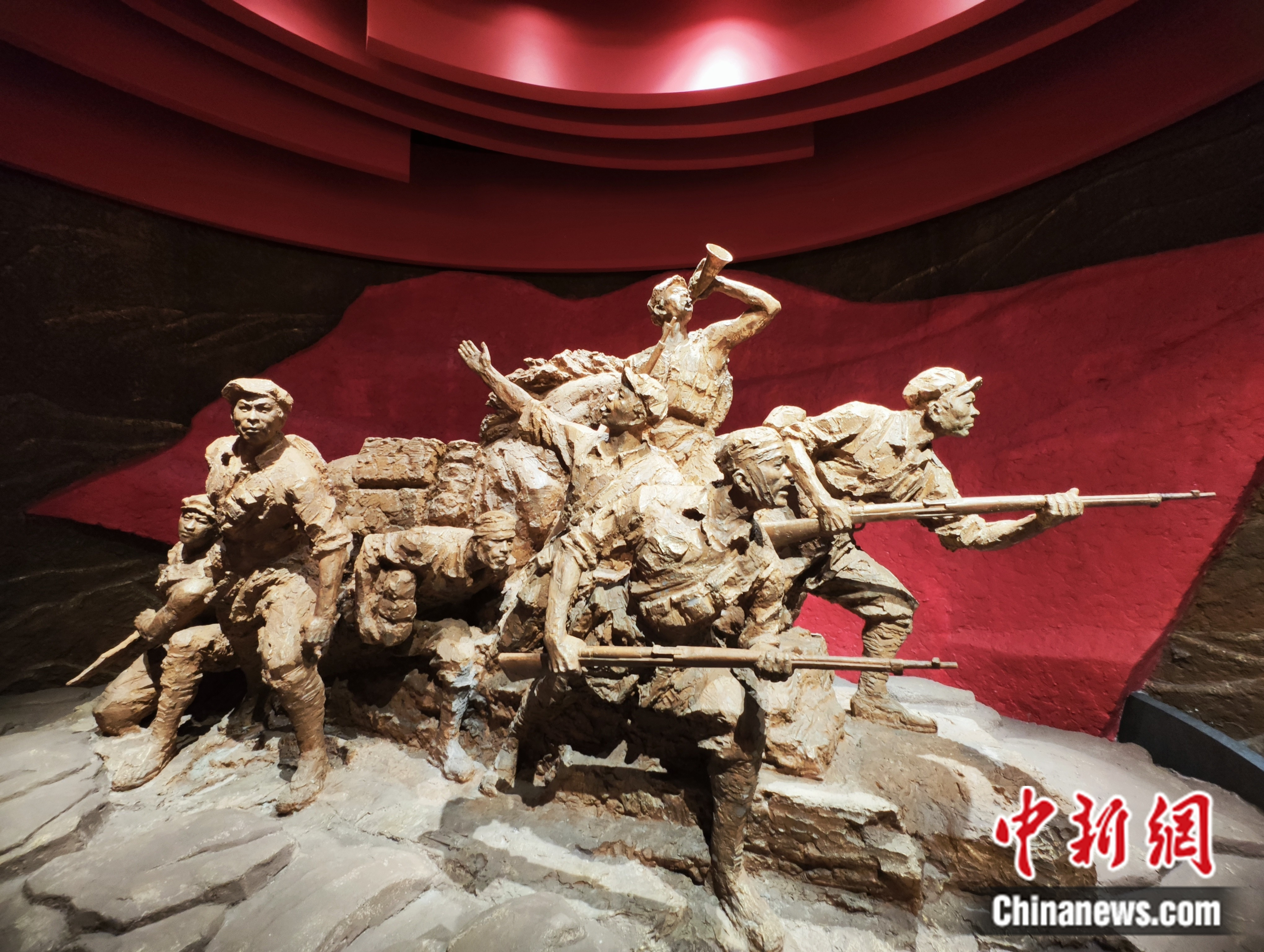 展館正門外,“風展紅旗如畫”的雕塑兩側,十座紅軍司號員雕像映入眼簾,它們高數(shù)米,持小號,形態(tài)各異,繪出一幅如火如荼的革命畫卷。