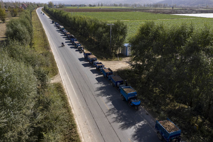 交售馬鈴薯的農用車在寧夏固原市西吉縣馬蓮鄉(xiāng)一家淀粉廠門前排起長隊(2020年10月21日攝,無人機照片)。新華社記者 王鵬 攝