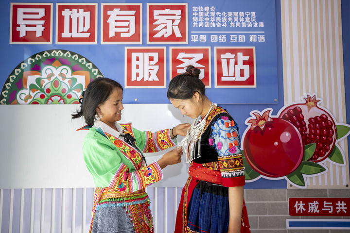 在寧夏青銅峽市瞿靖鎮(zhèn)毛橋村“異地有家”服務站,來自貴州的苗族務工人員楊文高(左)在給放暑假的大女兒整理服飾。楊文高將民族服飾從老家?guī)У綄幭?,在工作之余就會穿上民族服飾?024年8月23日攝)。新華社記者 楊植森 攝