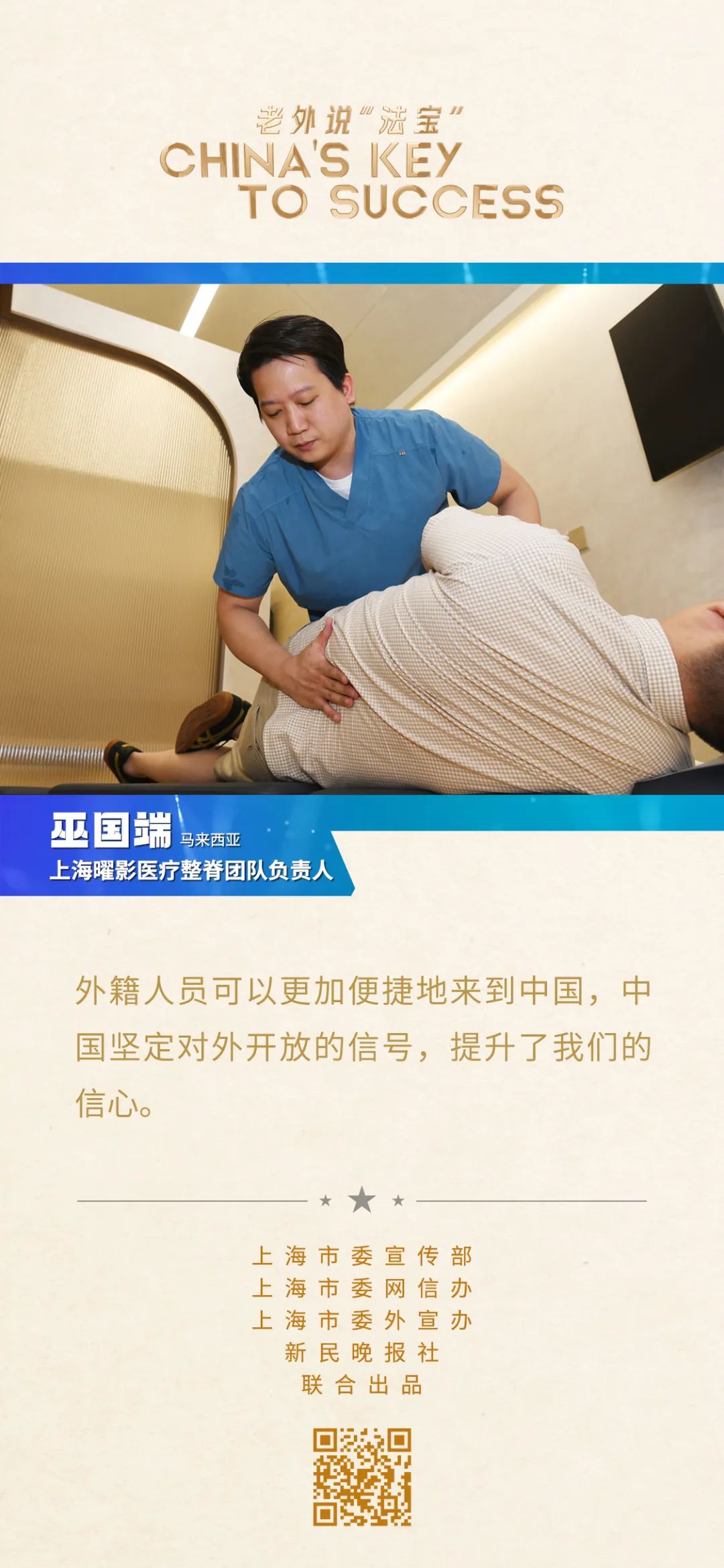 馬來(lái)西亞人巫國(guó)端是上海曜影醫(yī)療整脊團(tuán)隊(duì)負(fù)責(zé)人。2014年,他只身來(lái)到上海從事醫(yī)療工作,今年是他在這座城市的第十個(gè)年頭。