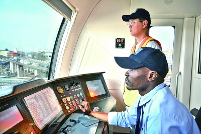 尼日利亞拉各斯,中國(guó)師傅指導(dǎo)當(dāng)?shù)匾娏?xí)司機(jī)駕駛中企承建的輕軌列車。新華社發(fā)