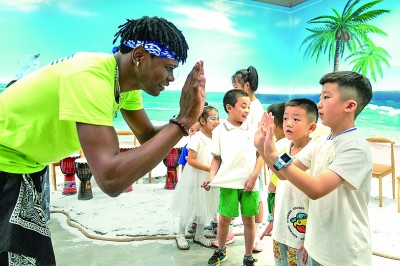 在位于湖南高橋大市場(chǎng)的中非經(jīng)貿(mào)博覽會(huì)常設(shè)展館安哥拉館,志愿者和學(xué)生在研學(xué)過程中擊掌。新華社發(fā)
