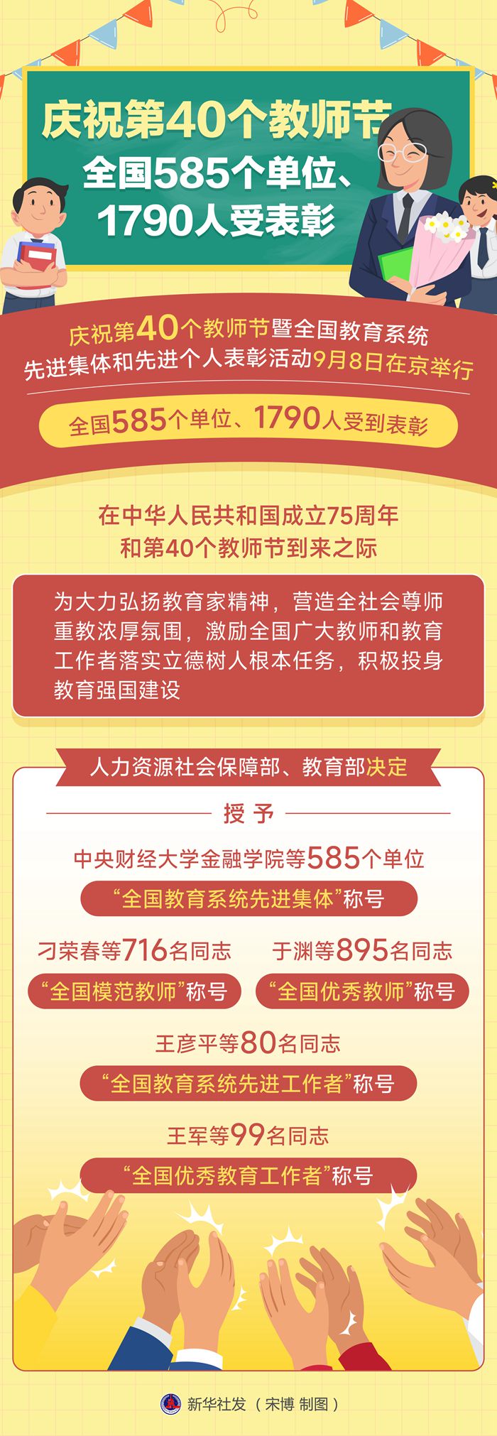 新華社北京9月8日電 慶祝第40個教師節(jié)暨全國教育系統(tǒng)先進集體和先進個人表彰活動8日在京舉行。全國585個單位、1790人受到表彰。