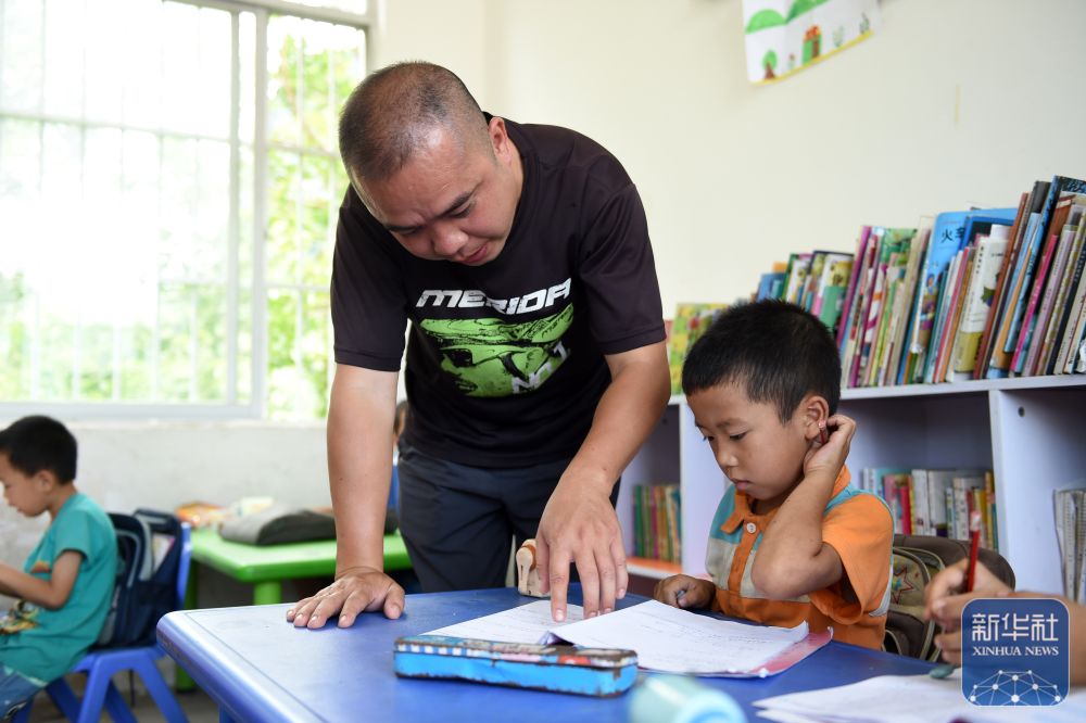 在廣西天等縣龍茗鎮(zhèn)東南村煙屯教學(xué)點,“80后”老師董祥在輔導(dǎo)學(xué)生功課(2015年6月23日攝)。