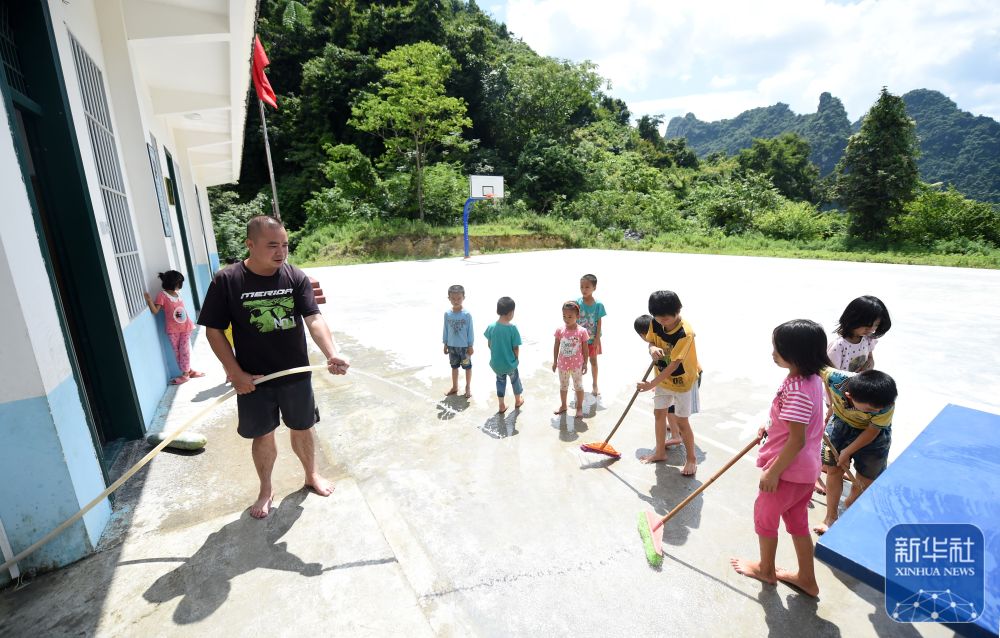 在廣西天等縣龍茗鎮(zhèn)東南村煙屯教學(xué)點,“80后”老師董祥在和學(xué)生一起做衛(wèi)生(2015年6月23日攝)。