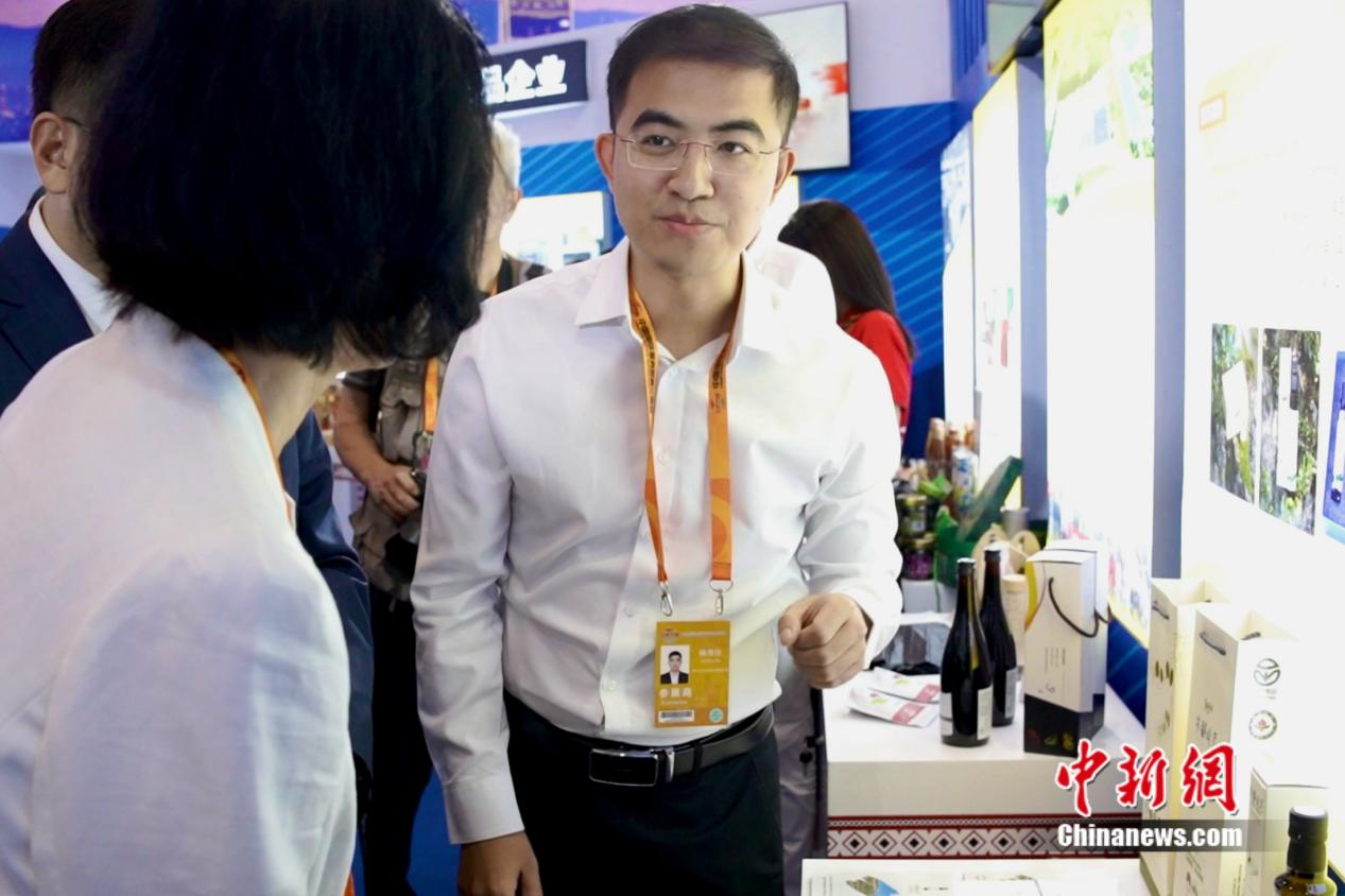 臺(tái)灣青年林書任推薦他從大涼山帶來的橄欖油。陳銀沙 攝