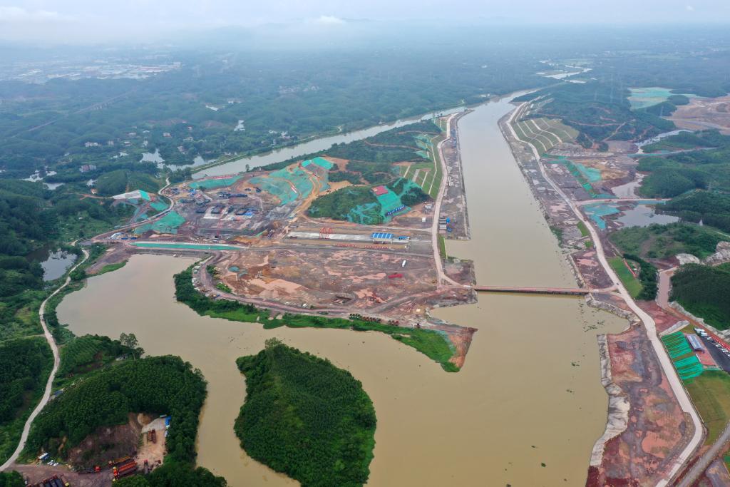 這是施工建設(shè)中的廣西平陸運河青年樞紐(2023年8月1日攝,無人機(jī)照片)。新華社記者 陸波岸 攝