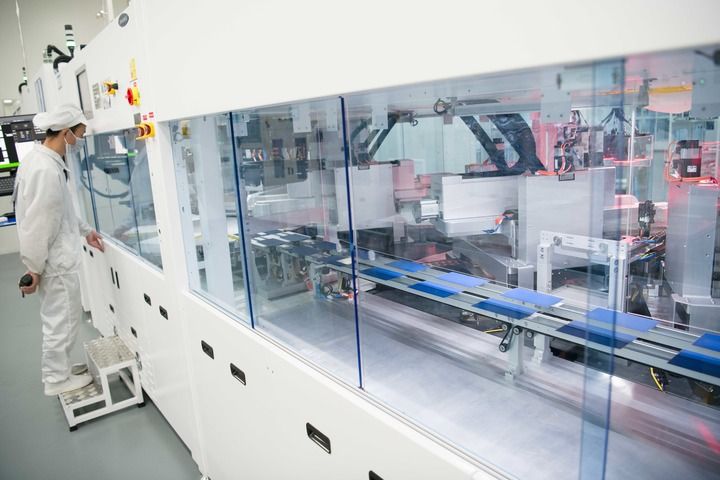 安徽合肥,全球單體產(chǎn)能最大的異質(zhì)結(jié)光伏電池及組件一體化工廠,工業(yè)機(jī)器人將一個(gè)個(gè)硅片投送到一架白色機(jī)器的腔體,經(jīng)過(guò)綿延的智能化流水線,狀如手機(jī)大小、薄如紙片的光伏電池片便下線了。