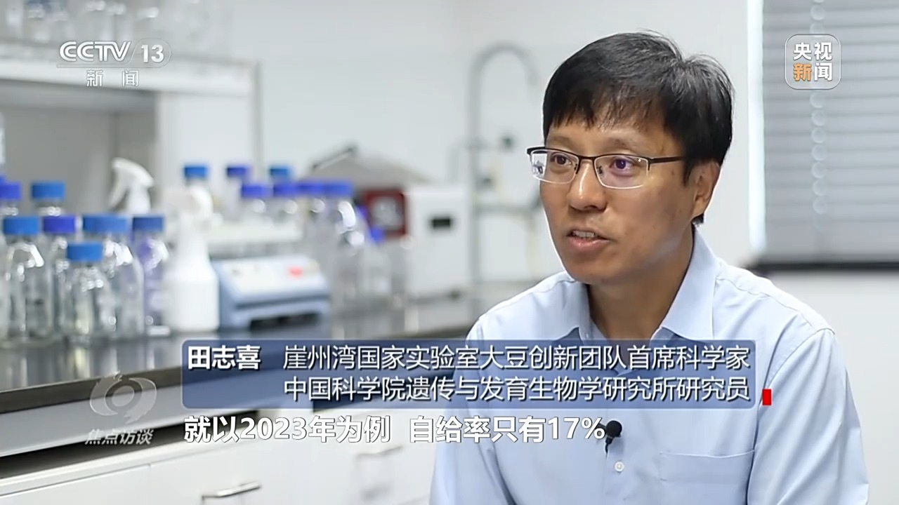 崖州灣國(guó)家實(shí)驗(yàn)室大豆創(chuàng)新團(tuán)隊(duì)首席科學(xué)家、中國(guó)科學(xué)院遺傳與發(fā)育生物學(xué)研究所研究員 田志喜:中國(guó)大豆的自給率太低了,以2023年為例,只有17%,在這種情況下,保證我們糧食安全,大豆義不容辭、責(zé)無(wú)旁貸,提高它的自給率。