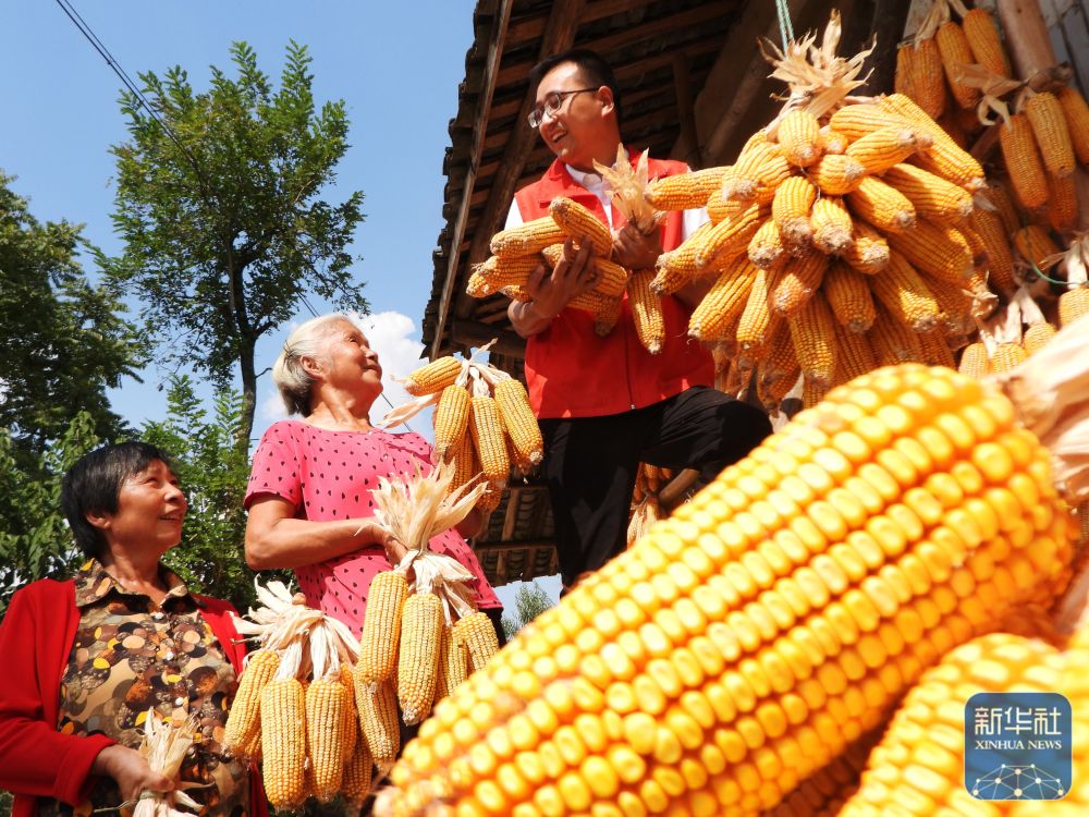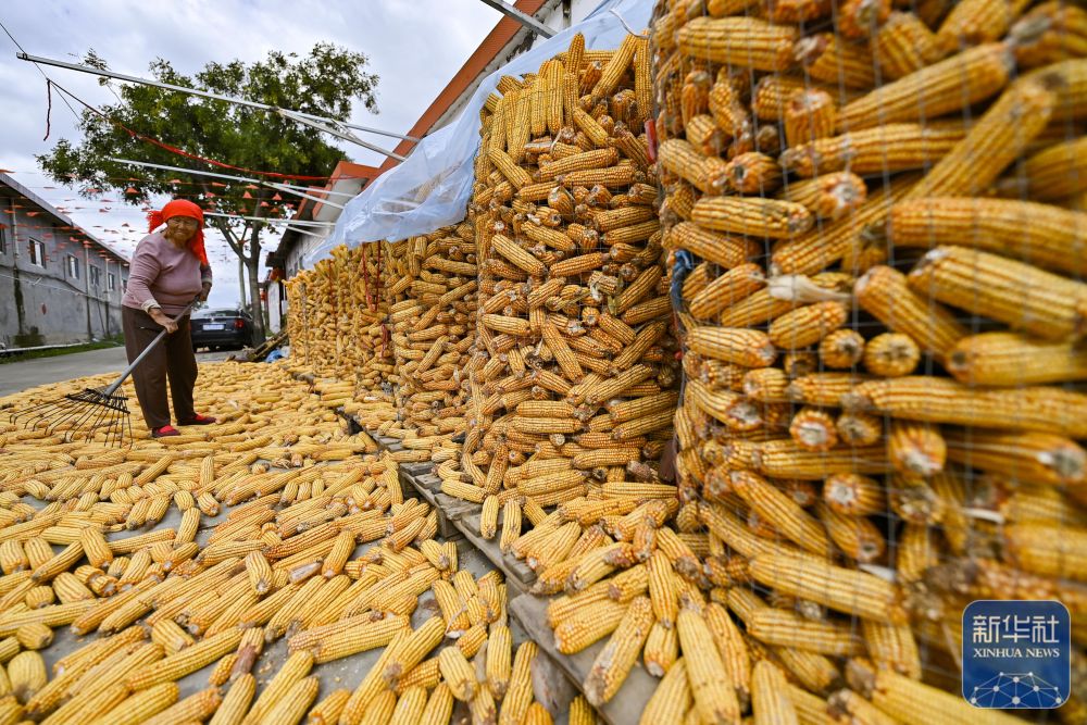 9月22日,在四川省達(dá)州市大竹縣朝陽鄉(xiāng)木魚村,駐村工作隊員和村民在晾曬收獲的玉米。