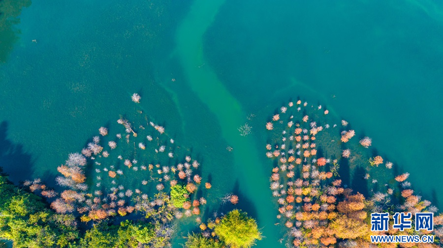 航拍廣東中山落羽杉與藍天碧水相映成趣。新華網(wǎng)發(fā)(黃健斌 攝)