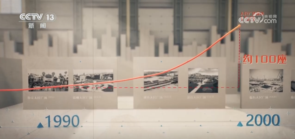 追溯歷史,將人民廣場的建設(shè)與時間線關(guān)聯(lián),我們發(fā)現(xiàn)了全國人民廣場建設(shè)的兩個重要時間節(jié)點(diǎn):在90年代,隨著城鎮(zhèn)化的步伐,更多的廣場滿足了人們對公共空間的新需求,大約有100座人民廣場在這十年間建成。2013年左右,一股新的建設(shè)浪潮出現(xiàn)在小型縣城,尤其是在剛剛擺脫貧困的地區(qū)興起,人民廣場的增量又與脫貧攻堅(jiān)的進(jìn)程同步見證了一塊塊土地從貧瘠到繁榮的動人變遷。