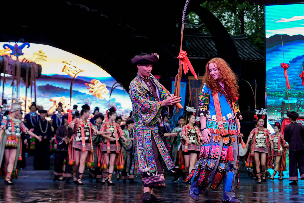 9月16日,美國青年學(xué)生在貴州省西江千戶苗寨體驗民族歌舞。(圖片來源:新華社)