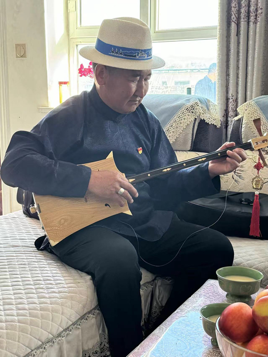 甫·巴特孟克向采訪團(tuán)展示才藝,他住的安居房在2017年精河縣6.6級地震中安然無恙。新華網(wǎng)發(fā)