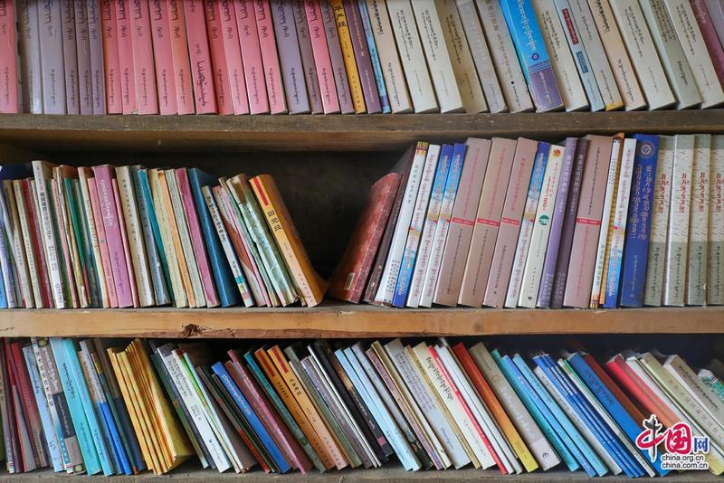 扎西達杰介紹藏書。中國網(wǎng)記者鄭偉攝