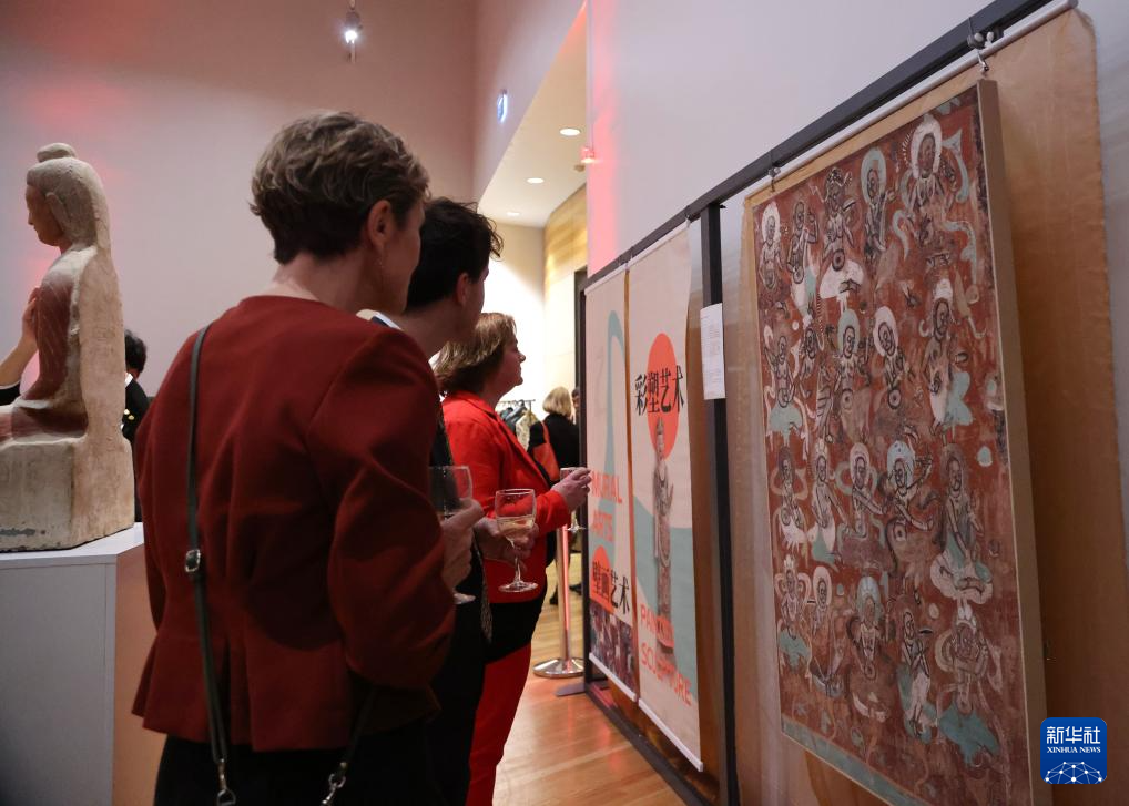 9月26日晚,在新西蘭首都惠靈頓舉行的中國駐新西蘭大使館國慶招待會上,嘉賓們駐足觀看敦煌文化展。新華社發(fā)(孟韜攝)