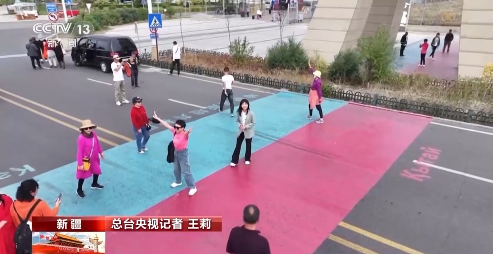 總臺央視記者 王莉:進入合作中心,中哈連接通道處的“一步跨兩國”,絕對是游客的打卡首選地。紅色和藍色交界的地方,就是國界線了,線的一側紅色區(qū)域代表中國,藍色區(qū)域代表哈薩克斯坦。前一秒還在中國,只要一腳邁過分界線,就能一秒“出國”,來到哈薩克斯坦。