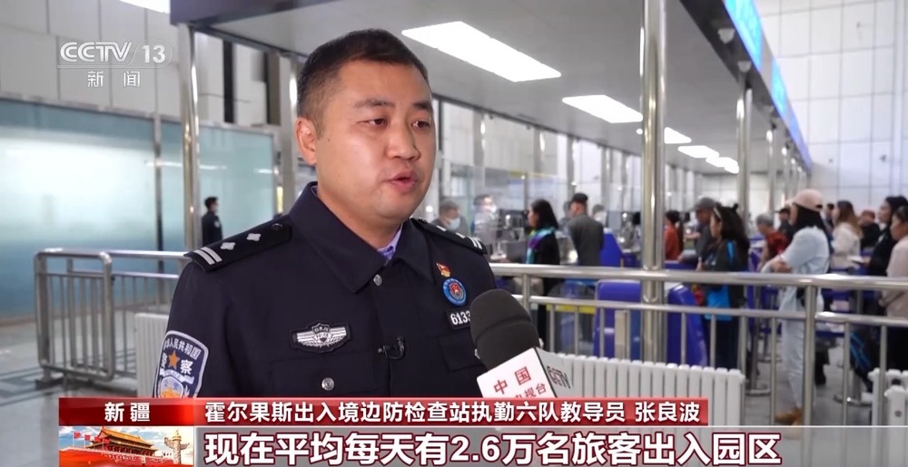 霍爾果斯出入境邊防檢查站執(zhí)勤六隊教導員 張良波:現在平均每天有2.6萬名旅客出入園區(qū),為最大限度保障旅客高效快速通關,我們采取錯時通關模式。我們也會根據旅客的流量情況,動態(tài)調整我們的人工查驗通道,最高可以加開到12條。