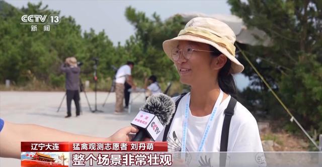 猛禽觀測志愿者 劉丹萌:“萬猛日”當天真的心情非常激動,整個場景非常壯觀,可以看到無數的小黑點從這個山頭開始冒起,像一條河一樣非常長,一直連到對面的山東煙臺,這一整片天空全部都被猛禽占滿了,實在是太震撼、太壯觀了。