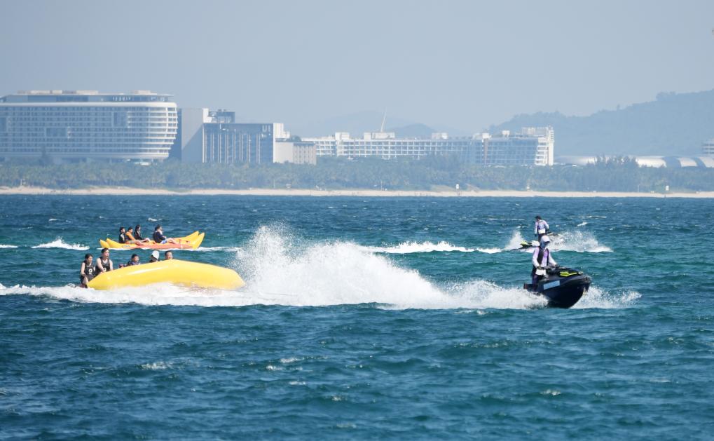 10月4日,在海南三亞蜈支洲島旅游區(qū),游客體驗(yàn)海上項(xiàng)目。新華社記者趙穎全 攝