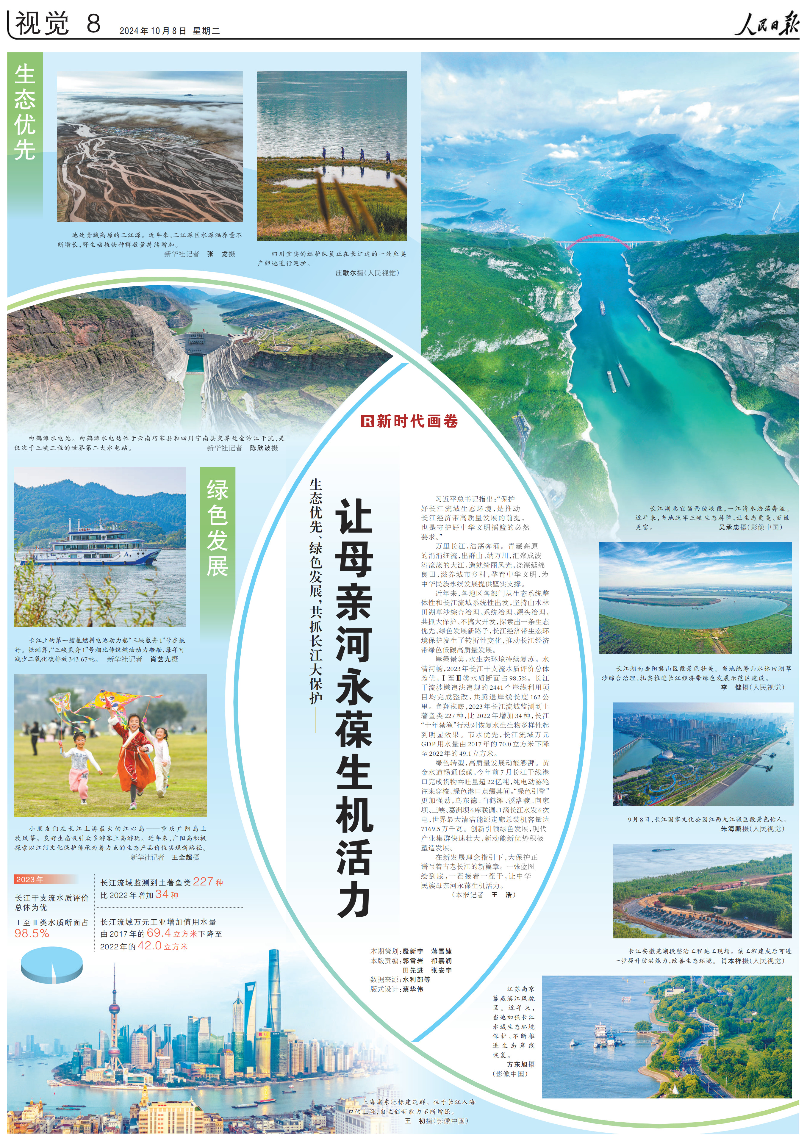 岸綠景美,水生態(tài)環(huán)境持續(xù)復(fù)蘇。水清河暢,2023年長(zhǎng)江干支流水質(zhì)評(píng)價(jià)總體為優(yōu),Ⅰ至Ⅲ類水質(zhì)斷面占98.5%。長(zhǎng)江干流涉嫌違法違規(guī)的2441個(gè)岸線利用項(xiàng)目均完成整改,共騰退岸線長(zhǎng)度162公里。魚翔淺底,2023年長(zhǎng)江流域監(jiān)測(cè)到土著魚類227種,比2022年增加34種,長(zhǎng)江“十年禁漁”行動(dòng)對(duì)恢復(fù)水生生物多樣性起到明顯效果。節(jié)水優(yōu)先,長(zhǎng)江流域萬(wàn)元GDP用水量由2017年的70.0立方米下降至2022年的49.1立方米。