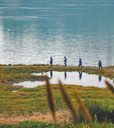 四川宜賓的巡護(hù)隊(duì)員正在長(zhǎng)江邊的一處魚類產(chǎn)卵地進(jìn)行巡護(hù)。莊歌爾攝(人民視覺)