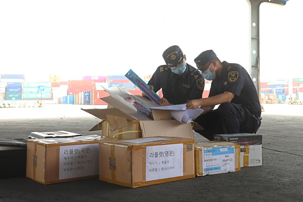 廣州海關(guān)所屬南沙海關(guān)關(guān)員對第136屆廣交會(huì)進(jìn)口展品進(jìn)行監(jiān)管。(麥東豪攝)