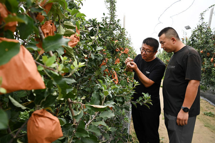 延安市安塞區(qū)果業(yè)技術(shù)推廣中心主任張剛(左)在果園觀察果樹長勢(2024年8月8日攝)。新華社記者 鄒競一 攝