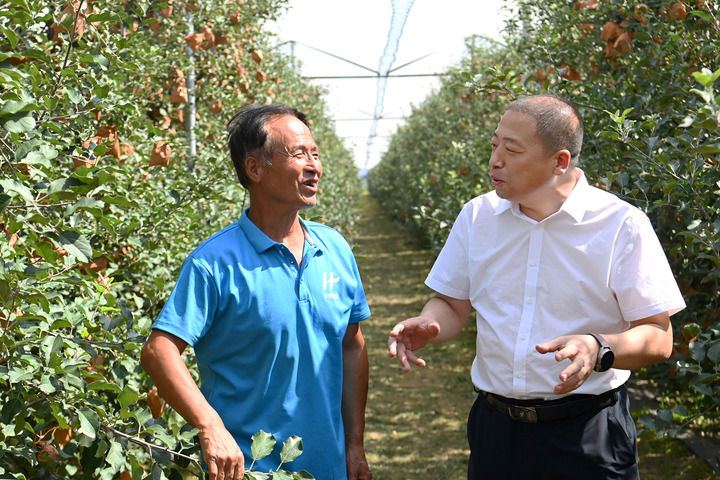 延安市洛川縣槐柏鎮(zhèn)黨委書記解賀宏(右)在果園與果農(nóng)交流(2024年8月5日攝)。新華社記者 鄒競一 攝