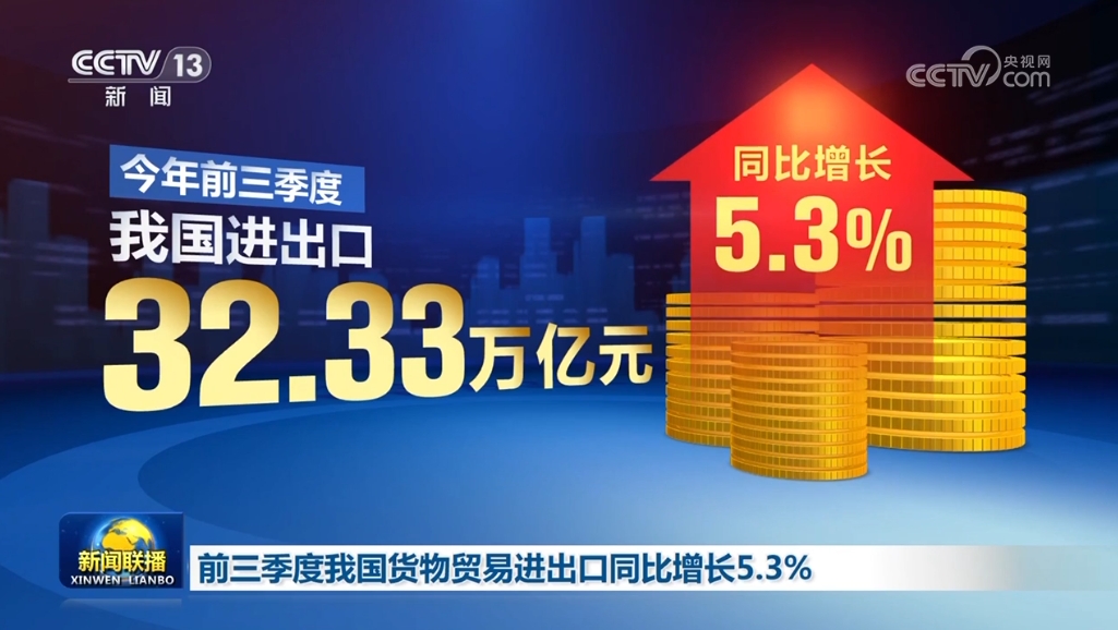 據(jù)海關(guān)統(tǒng)計(jì),今年前三季度,我國(guó)進(jìn)出口32.33萬(wàn)億元,同比增長(zhǎng)5.3%。其中出口18.62萬(wàn)億元,增長(zhǎng)6.2%;進(jìn)口13.71萬(wàn)億元,增長(zhǎng)4.1%。