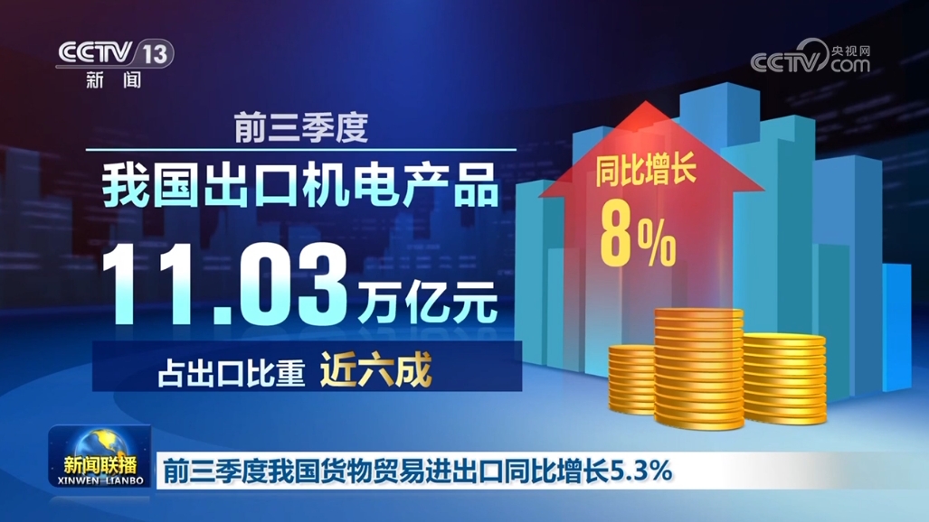 從國(guó)內(nèi)看,出口產(chǎn)品結(jié)構(gòu)持續(xù)優(yōu)化。前三季度,我國(guó)出口機(jī)電產(chǎn)品11.03萬(wàn)億元,同比增長(zhǎng)8%,占出口比重近六成。