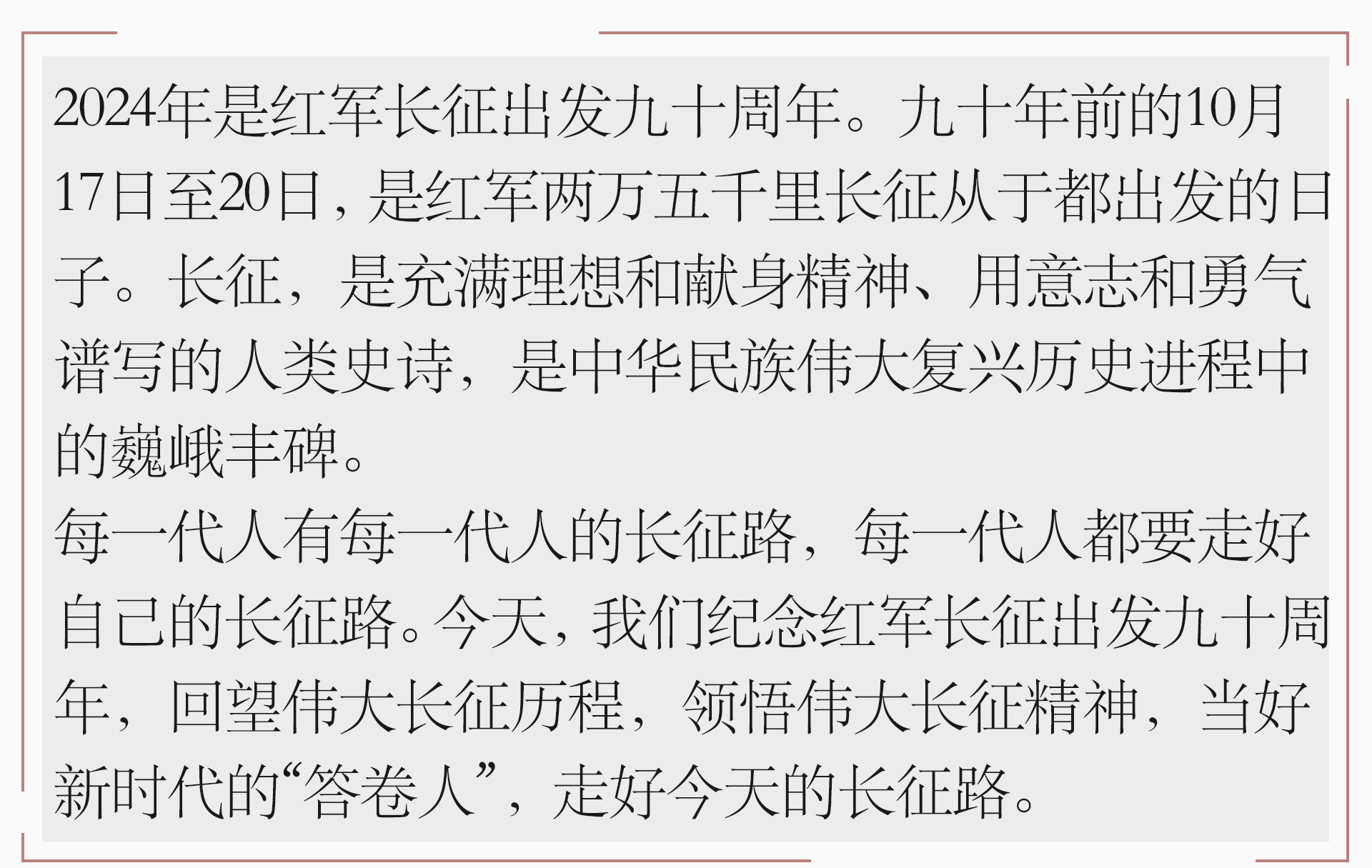 長征是一次理想信念的偉大遠征。中國共產黨領導紅軍,以非凡的智慧和大無畏的英雄氣概,戰(zhàn)勝千難萬險,付出巨大犧牲,勝利完成震撼世界、彪炳史冊的長征,實現(xiàn)了中國共產黨和中國革命事業(yè)從挫折走向勝利的偉大轉折,開啟了中國共產黨為實現(xiàn)民族獨立、人民解放而斗爭的新的偉大進軍。