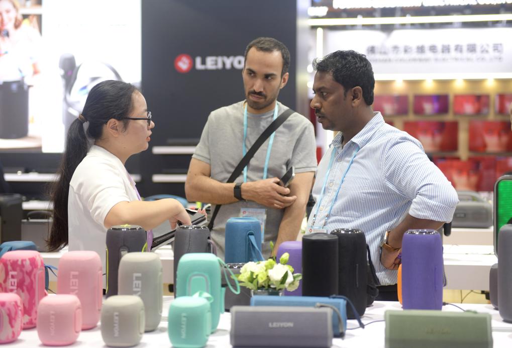 10月15日,客商在廣交會(huì)展館內(nèi)參觀選購音箱。新華社記者盧漢欣 攝