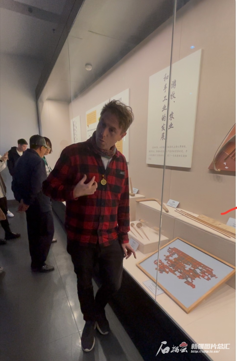 “你們看,這件文物的花紋,跟我的襯衫花紋一樣,古人也很時尚??!”10月20日,參加“中國有約·相約新疆”2024國際媒體采訪活動的自媒體創(chuàng)作者——來自英國的托比在吐魯番博物館參觀時,指著展示柜的一件文物興奮地說。