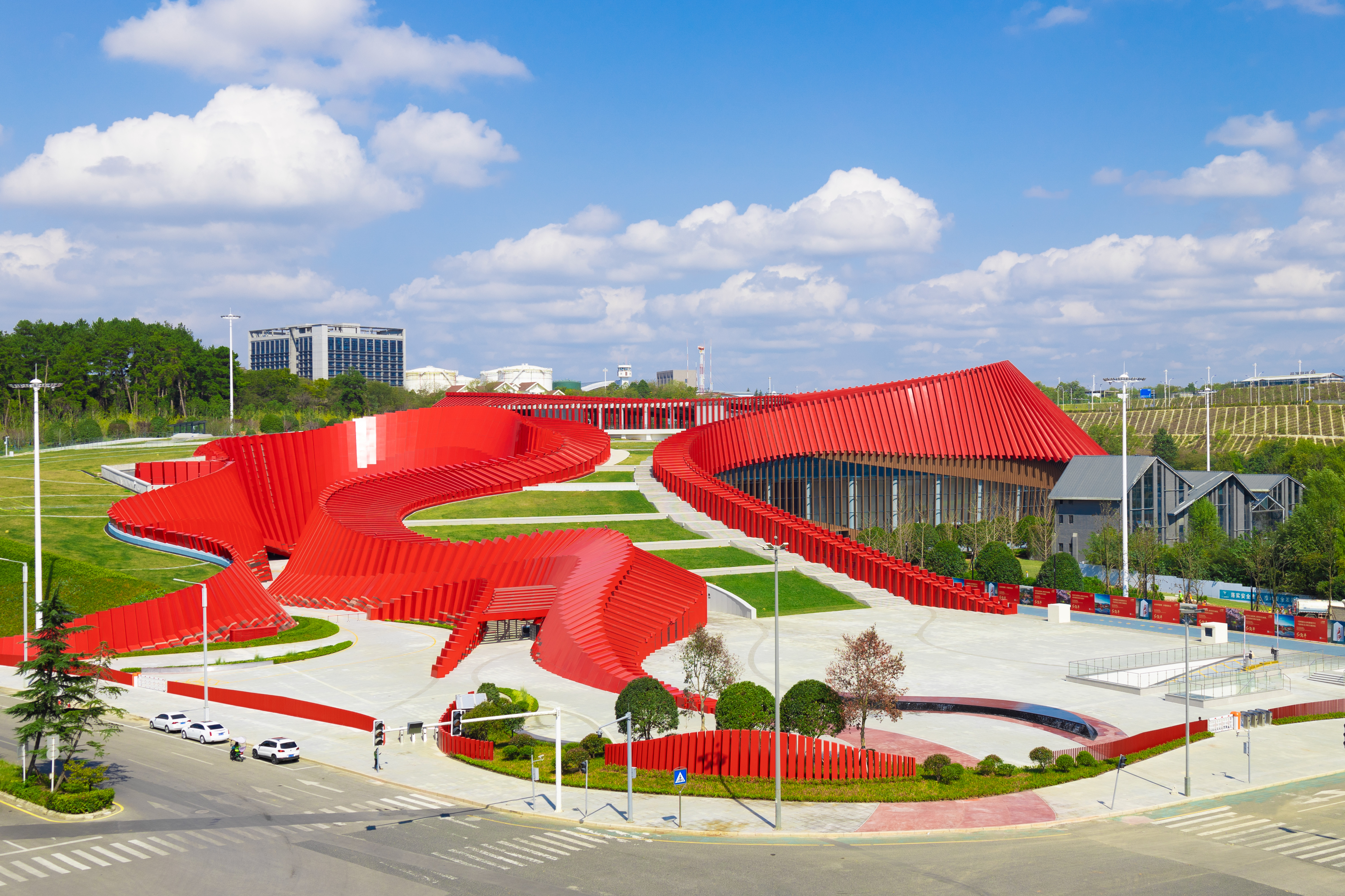 乘坐航班前往貴陽的游客,若在貴陽龍洞堡機場上空俯瞰,可發(fā)現(xiàn)有一座巨型建筑鋪展在青山綠水之間。它由一塊塊紅色的曲面幕墻構(gòu)成,此起彼伏,形成了連續(xù)轉(zhuǎn)折的動態(tài)輪廓,猶如一條靈動的“紅飄帶”。它就是全國首個以長征為主題的全域沉浸式數(shù)字科技體驗館,也是長征國家文化公園貴州重點建設(shè)區(qū)的標(biāo)志性、引領(lǐng)性工程。