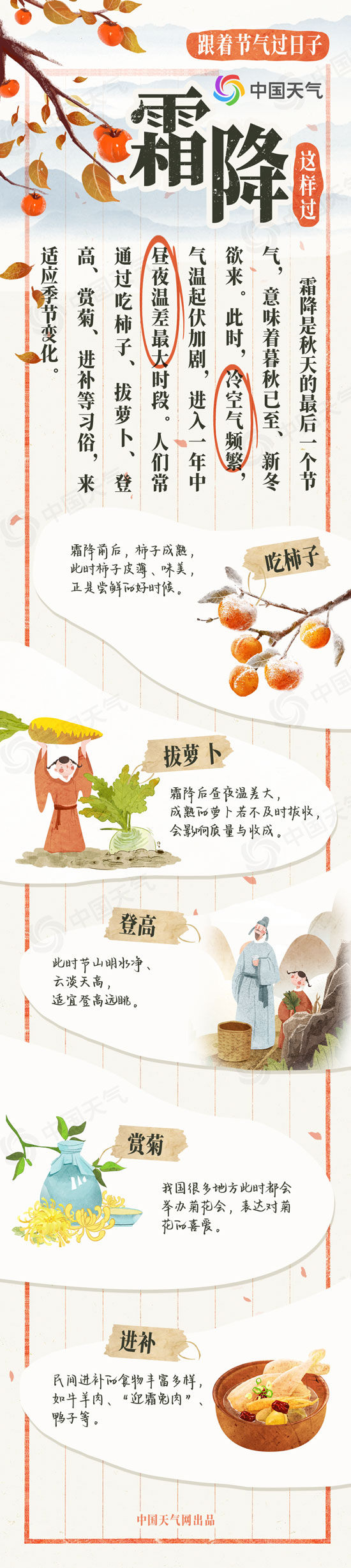 春生夏長,秋收冬藏,跟著節(jié)氣過日子。今天(10月23日)進(jìn)入秋天的最后一個節(jié)氣——霜降,意味著暮秋已至、新冬欲來。此時,冷空氣頻繁,氣溫起伏加劇,進(jìn)入一年中晝夜溫差最大時段。人們常通過吃柿子、拔蘿卜、登高、賞菊、進(jìn)補(bǔ)等習(xí)俗,來適應(yīng)季節(jié)變化。中國天氣網(wǎng)特別推出霜降風(fēng)俗圖鑒和霜降全國天氣地圖,看看這個節(jié)氣怎么過。