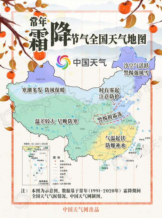 “霜降三旬后,蓂馀一葉秋。”常年霜降節(jié)氣期間,影響我國的冷空氣越來越頻繁,多地天氣由涼轉(zhuǎn)寒,晝夜溫差增大。隨著氣溫走低,冬季的地盤也開始擴(kuò)張,內(nèi)蒙古、東北大部、山西、河北北部等地往往在霜降時節(jié)步入冬季,秋天最前沿會抵達(dá)江南南部地區(qū)。