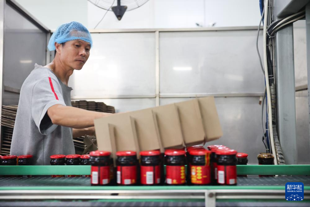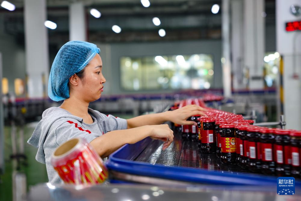 工作人員在老干媽生產線上整理貨品(8月20日攝)。新華社記者 劉續(xù) 攝