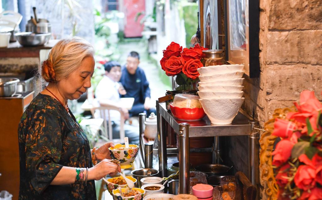 現(xiàn)在周英碧在山城巷經(jīng)營(yíng)著一家小吃店,旺季時(shí)每天能接待上百個(gè)客人。她最喜歡的事就是閑時(shí)和游客“擺擺龍門陣”,給他們講一講山城巷的故事。